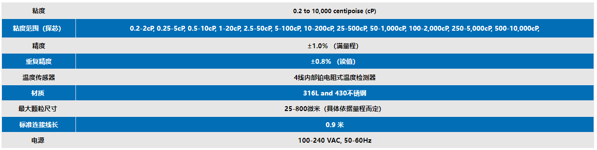 可在12個20:1粘度范圍內進行測量。粘度可顯示為CP或CST,溫度可顯示為°C或°F。集成溫度控制允許用戶在高于環境溫度至356°F(180°C)和高于環境溫度至-40°C的任意設置下進行測量,并配備可選的冷卻套。該傳感器易于現場校準。可以預先校準多個工作范圍和產品設置。